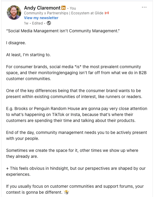 Then, the following weekend, I made a LinkedIn post suggesting that Community Management and Social Media Management aren’t all that different: